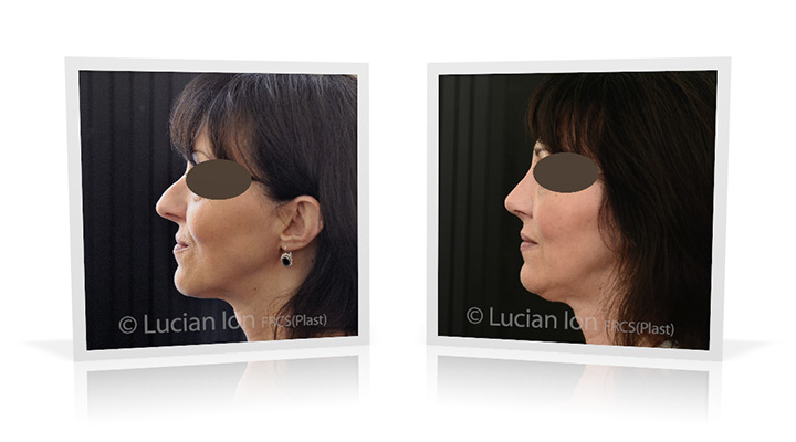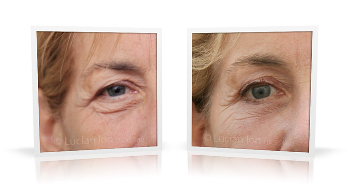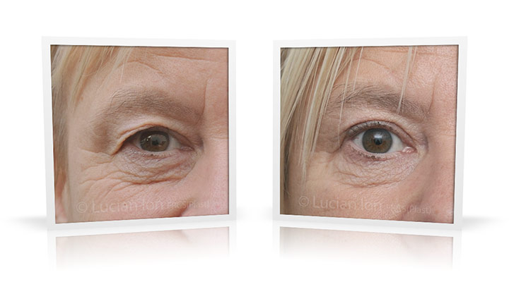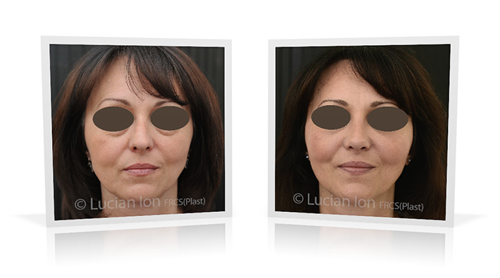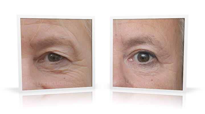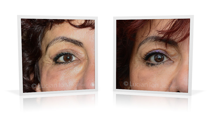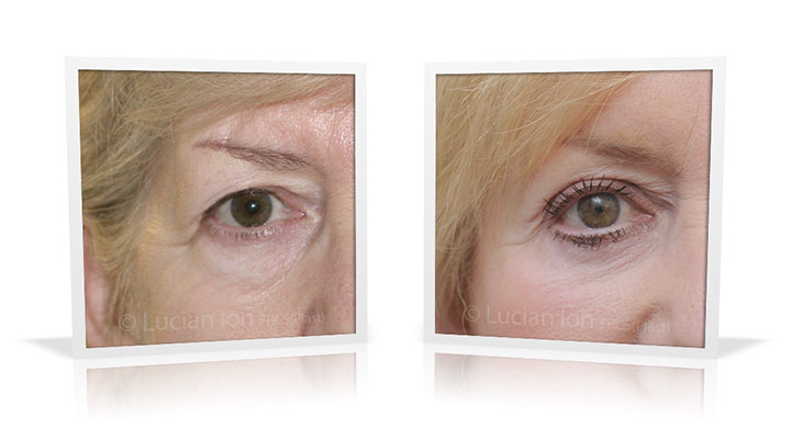 The surgery involved for the upper eyelid blepharoplasty removal of some of the skin excess to create a relatively even upper eyelid show, and for the lower eyelid reduction of the volume excess and partial redraping of the fatty tissue from the eyelid bags over the tear trough to improve the appearance of the lid-cheek junction. Conservatives can reduction and mild lift of the cheek tissues. by Lucian Ion (FRCS) | 59 |