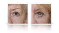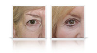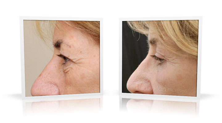 | 65 | Upper and lower eyelid surgery combined with endoscopic brow lift. Advanced sun damage creates a more profound impression of ageing of the skin in the area, with severe hooding of the upper eyelid, and deep and coarse lower eyelid and crows feet lines. The lower eyelid support is weakened, with lower eyelid malposition, and visibility of the conjunctiva below the lower border of the iris.