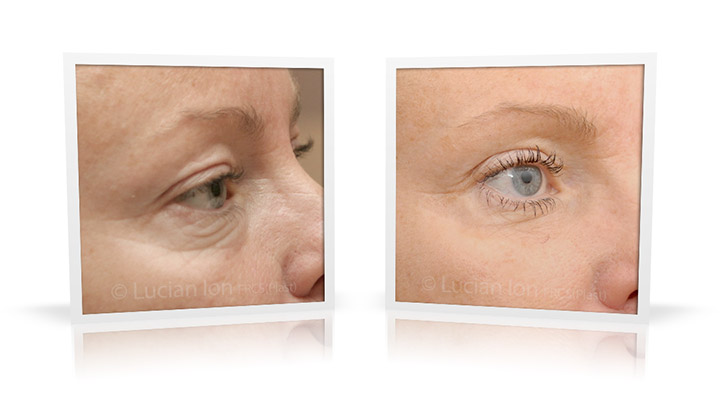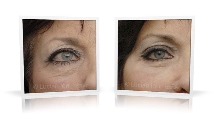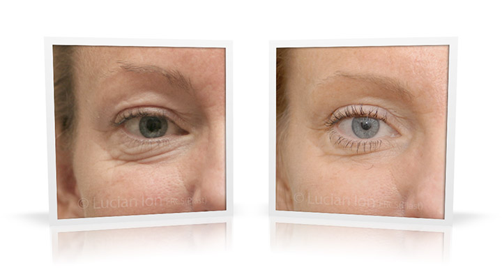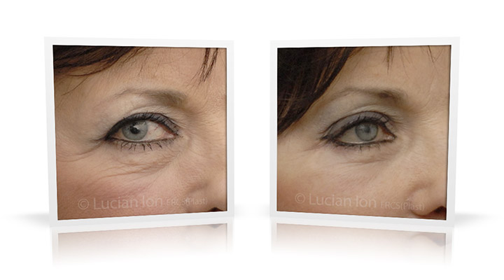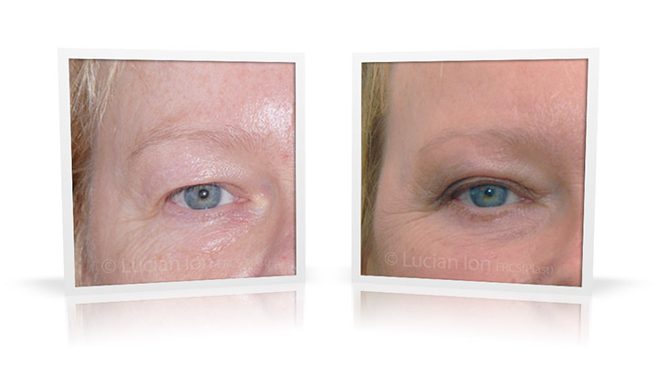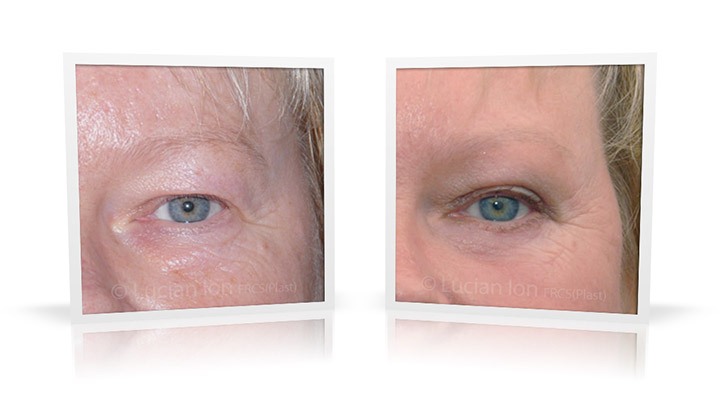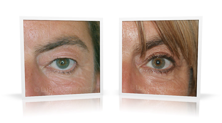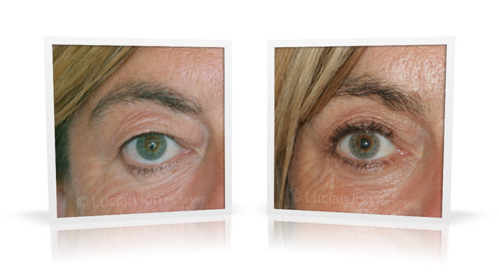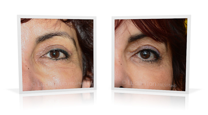 The surgery involved removal of the upper eyelid skin excess combined with slight elevation of the eyebrow. For the lower eyelid, Brown tightening and elevation of the lid structures and support, conservative skin removal and lift off the cheek tissues SOOF lift) for support and to improve the appearance of the lid-cheek junction. by Lucian Ion (FRCS) |   |