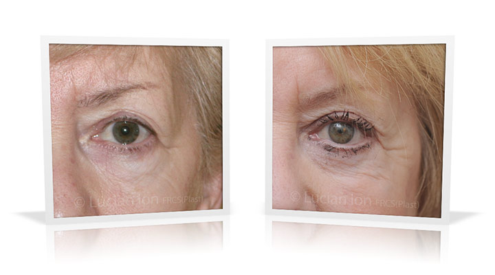 | Upper and lower eyelid blepharoplasty; relatively advanced skin laxity related to combination of sun damage and changes associated with ageing, leading to significant lateral hooding for the upper eyelid, festoons of orbicularis muscle distorting the lower eyelid.