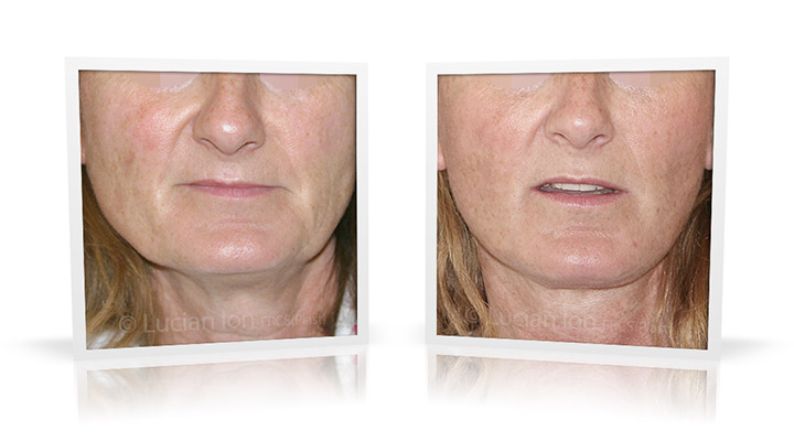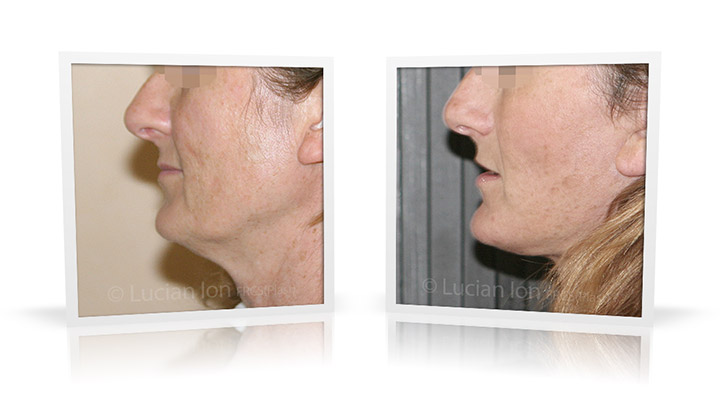 | 55 | Facial rejuvenation involving SMAS facelift combined with fat transfer to the cheekbone area. The facelift contributes softening to the nasolabial and labiomandibular lines (lines running from the corner of the nose and of the mouth) and a more defined contour of the jawline. The neck lift surgery involves reduction of the volume excess under the chin represented by fatty tissue primarily below the platysma muscle since the patient is generally thin. Maintaining a layer of fatty tissue under the neck skin preserves contour softness. Submandibular gland reduction was used to avoid lateral fullness under the jaw line. by Lucian Ion (FRCS) |   |